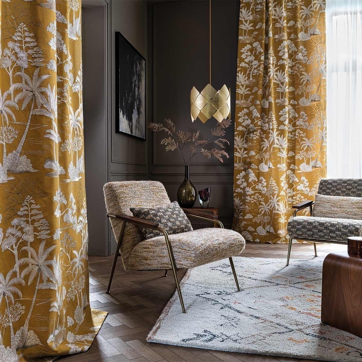 Larimar highlights an exotic motif that presents coconut palms and trees by the edge of a pond. This varied vegetation is drawn with fine details. This linen and cotton blend print offers a soft feel.