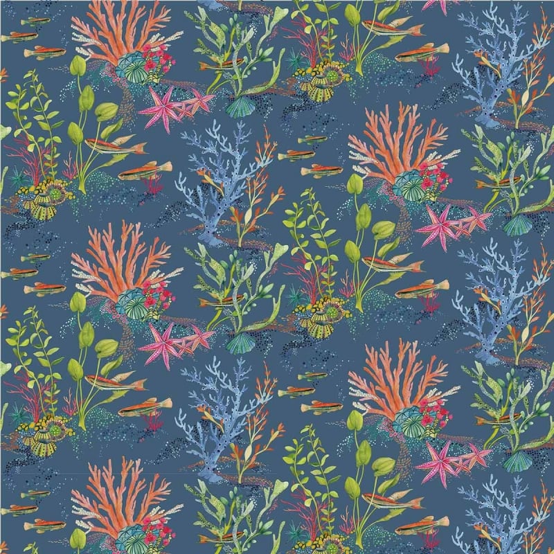 The Coralline fabric invites to discover the wonders of the ocean. Its pattern highlights an underwater scene where coral, seaweed, sea anemones, starfish, shells and shoals of fish are mixed. This multicolored decor is drawn on a background evoking a linen textile. This work created by Osborne & Little borrows light or dark shades.