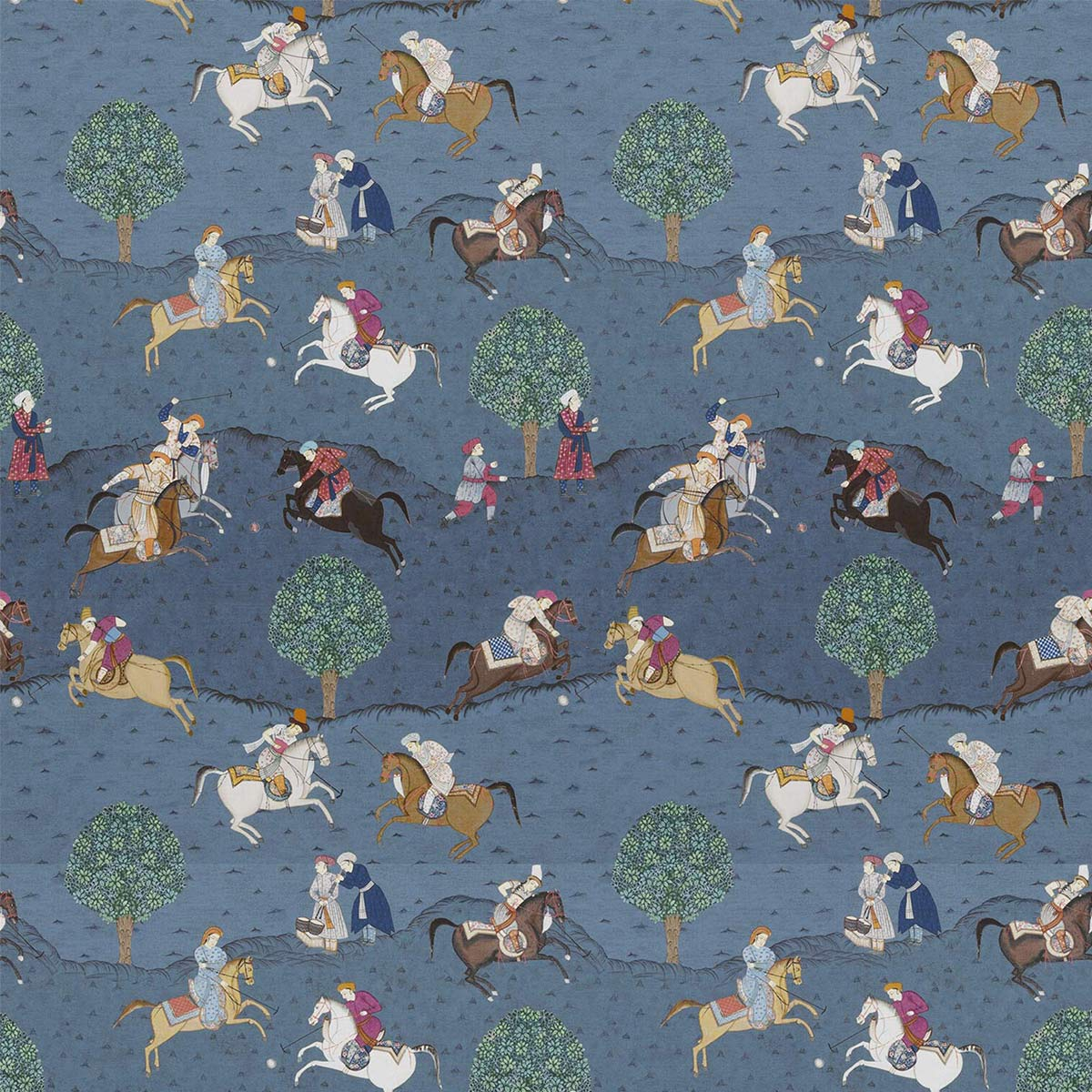 The Caspian fabric developed by GP & J Baker features a playful and highly decorative illustration. The design is set on a cotton fabric and features characters on horseback playing polo and wearing traditional clothing. The design has a natural colouring and comes to life on a dark, chalky background.