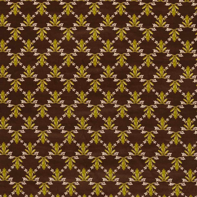 The Wood Frog cotton velvet, a design by Harlequin, features a playful pattern of frogs arranged in a lattice. Their cheerful and unusual colors are inspired by the real pigmentation of rare amphibians. Despite their entertaining nature, the figures maintain a certain elegance due to their balanced spacing and harmonious hues.