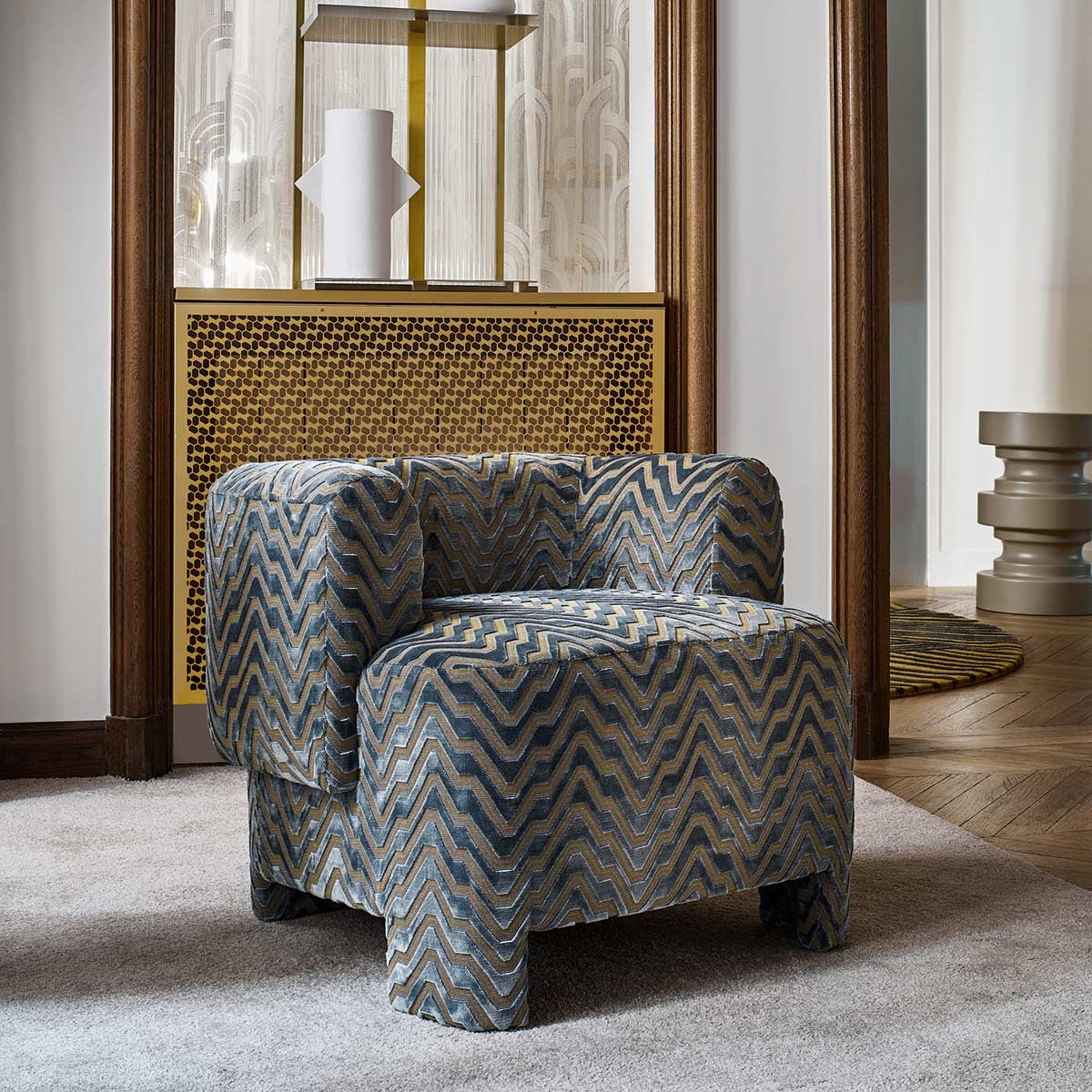 Pinned and partially cut, Chanut impresses with its sophisticated graphics. This fabric by Casamance features a chevron-inspired geometric design, but with a stylized twist. The interplay of relief between the pattern and the background adds an extra dimension to the texture, while the contrast between colors enhances its visual appeal. This densely draped model is available in warm and deep shades.