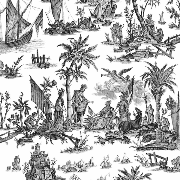 Testifying to key moments in History, the Toile de Jouy Lafayette is published by Charles Burger. These different scenes are drawn in sober colors on a plain background. The drawn, engraving-like appearance brings precision to this creation.