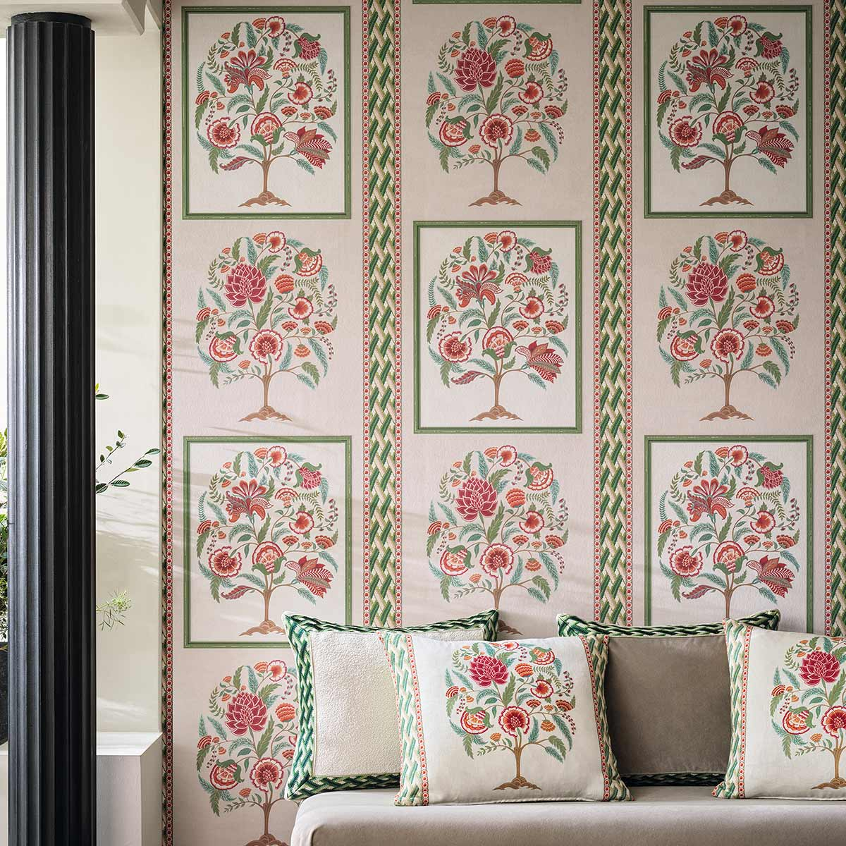 Capturing the essence of the divine in a contemporary design, Taniska fabric is a hymn to the goddess of gold. The motif, a tree of life adorned with paisley flowers, symbolizes growth and prosperity. It is surrounded by bands of latticework that frame it with subtlety. Against a background of light shades, this design unfolds in vivid, deep colors, creating a seductive contrast.