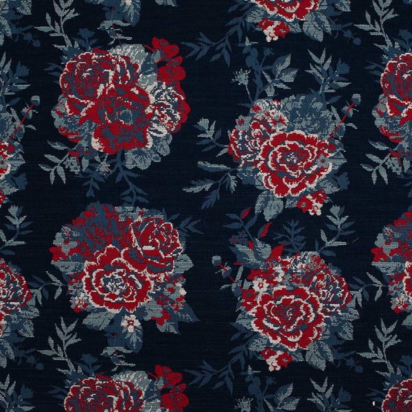 Quenin's Ronsard fabric celebrates the harmony between nature and art in a graphic floral burst. Its jacquard reveals large, exquisitely detailed bouquets, where each petal is meticulously structured by a looped wool thread. Its generous yet supple thickness offers a welcoming feel and ample drape. The vivid colours of the flowers stand out against a deep canvas, creating a charming bucolique scene.