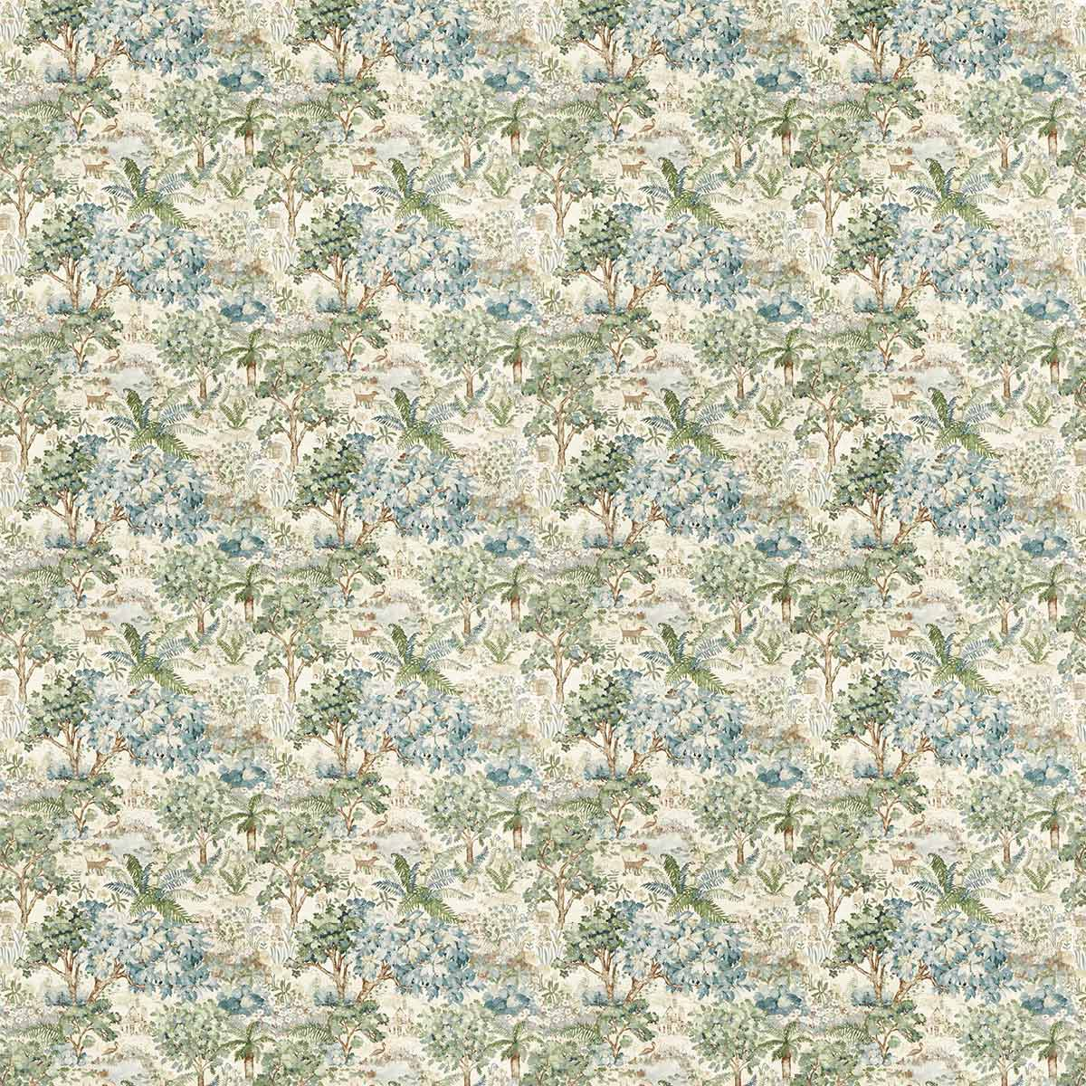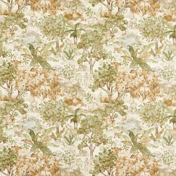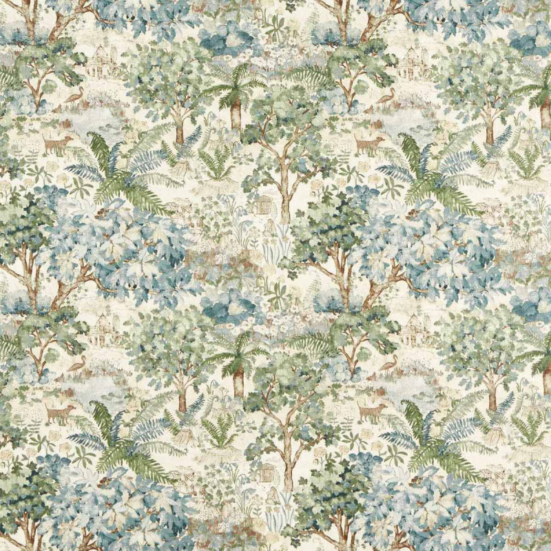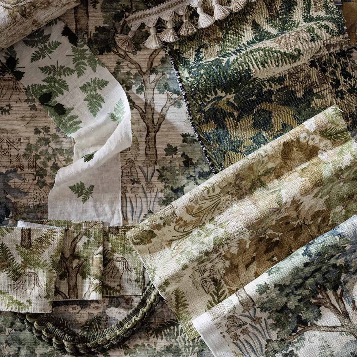 The Stumpery fabric explores a landscape motif, where ferns rub shoulders with tree stumps. It houses architectural elements such as a classical temple, a forgotten hut, a stone wall, and the Goddess of the Woods. The illustration, rich in detail, evokes a place inhabited by memory and silence. In this fabric, mostly cotton, Sanderson assembles nature and human traces.