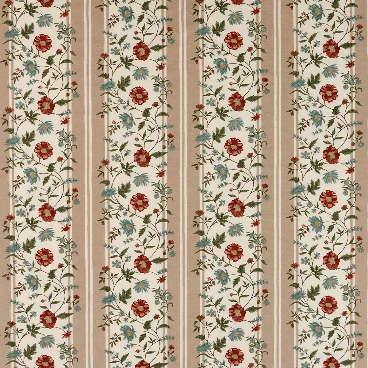 Colmar is a striped floral fabric by Nina Campbell. The design consists of flexible stems loaded with blooming corollas and small serrated leaves. Each vertical strip frames the climbing bouquets separated by plain intervals that structure the whole. The plant curves bring a feeling of continuous movement, in a classic decorative style with rustic accents.