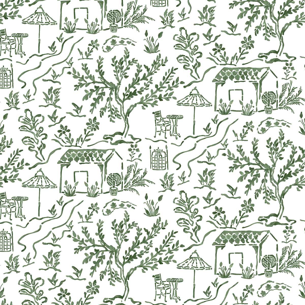 La Quintinie unfolds a country motif, full of charm and delicacy. This fabric illustrates a dream garden scene, where small houses with tiled roofs, finely branched trees and outdoor furniture rest in a peaceful setting. Every detail reflects the refined world of Nina Campbell, in a composition marked by calm and balance.