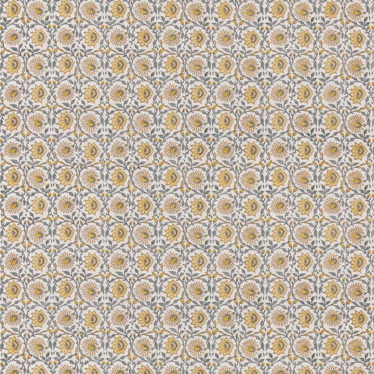 Cecily is a fabric embellished with a floral and geometric pattern in ordered medallions. Each circular shape frames a symmetrical flower surrounded by ornamental foliage. Placed on a linen support, the design composes a dense and precise decorative grid. The whole reveals a mastered repetition that evokes the textile spirit of traditional arts.