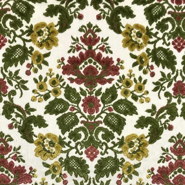 Velours Blois, a fabric by Antoine d'Albiousse, reveals a classic floral pattern inspired by the rich damasks of yesteryear. The cut velvet draws symmetrical and opulent bouquets on a plain background. The stylized flowers, foliage, and fruits bloom in a dense and refined composition. The soft texture associated with the relief provides a tactile sensation full of softness and character.