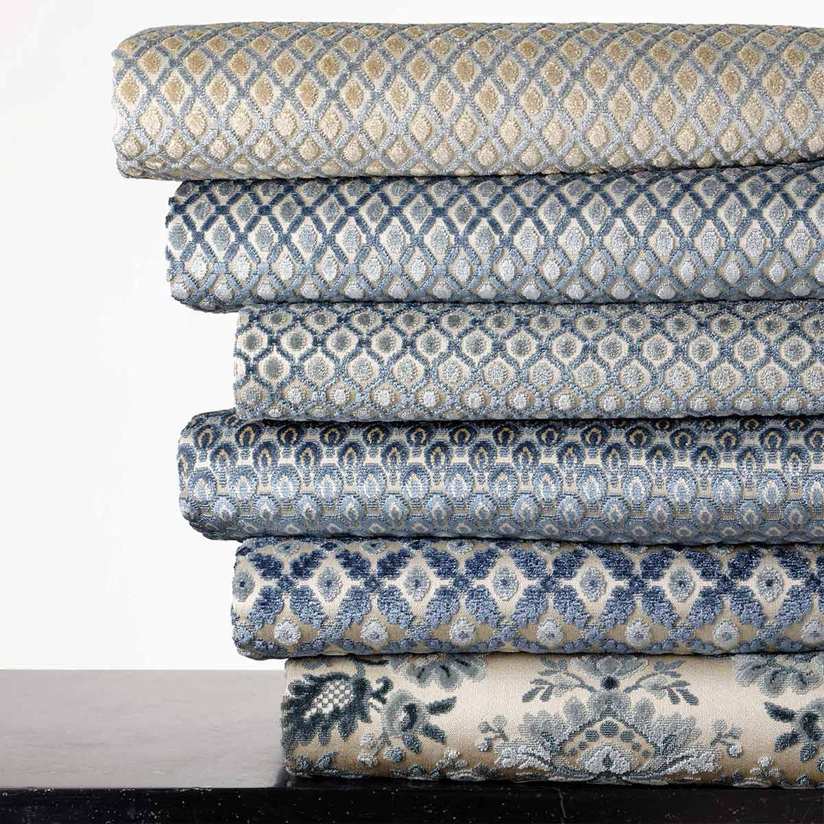 The Montreal velvet displays a geometric pattern formed of intertwined diamonds, with a regular appearance. This fabric, designed by Antoine d'Albiousse, is fascinating with the subtle relief of its figures, similar to refined scales. The repetition of ordered forms creates a graphic surface where each reflection makes the material vibrate. This fabric comes to life in the thickness of its texture, which gives it an enveloping presence.