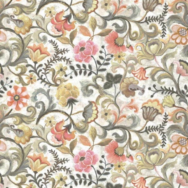 The Osier Damask Fabric by Designers Guild unfolds a lush plant design where supple tendrils and slender stems intertwine. Its pattern reveals a succession of blooming flowers, stylized corollas and delicate buds, punctuated by finely cut foliage and airy palmettes. The damask effect is expressed through subtle contrasts of material, which bring depth and relief to this composition inspired by ornamental gardens.