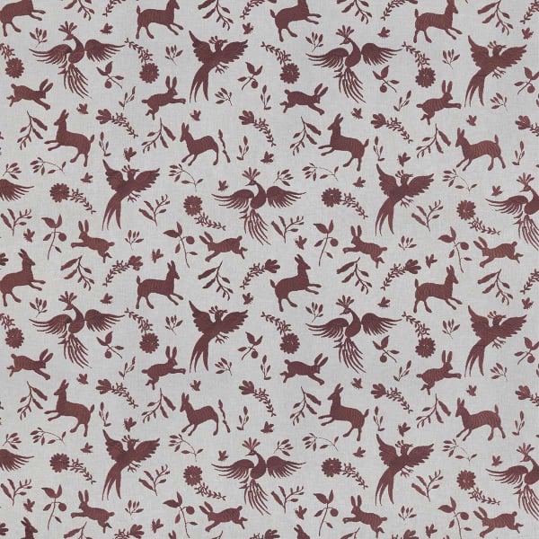 Gastón y Daniela delicately revisits a whimsical world in Otomi fabric. Leaping animals and stylized birds flourish among delicate flowers, creating a narrative pattern. Precise embroidery brings out each silhouette and creates a vibrant texture. Linen, the main material, gives the textile a natural drape and an organic breathability.