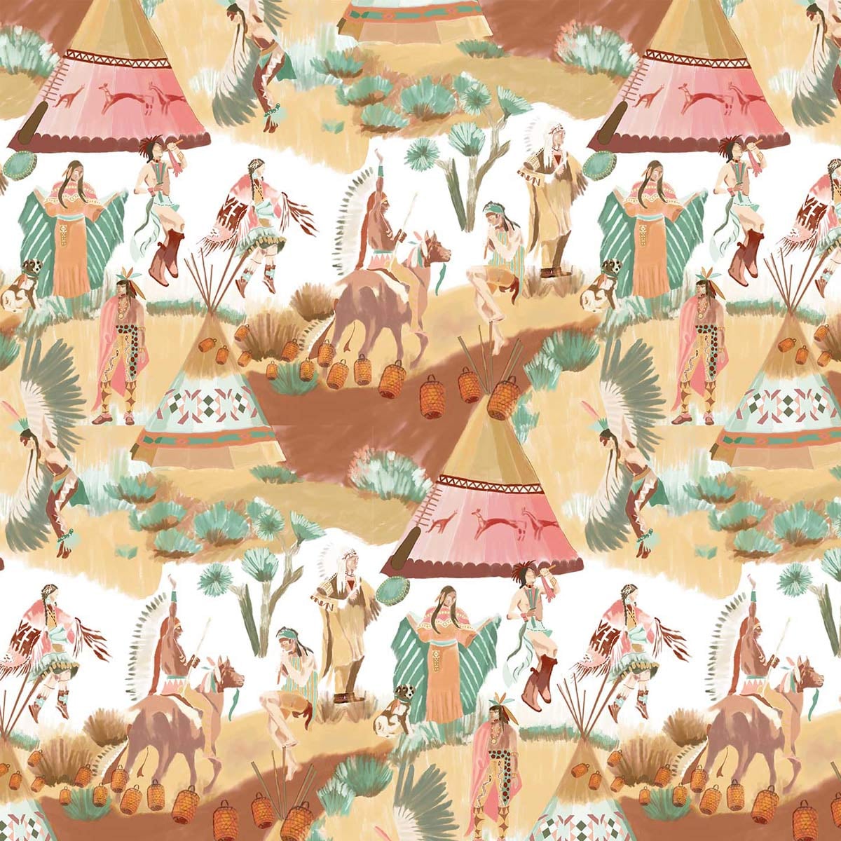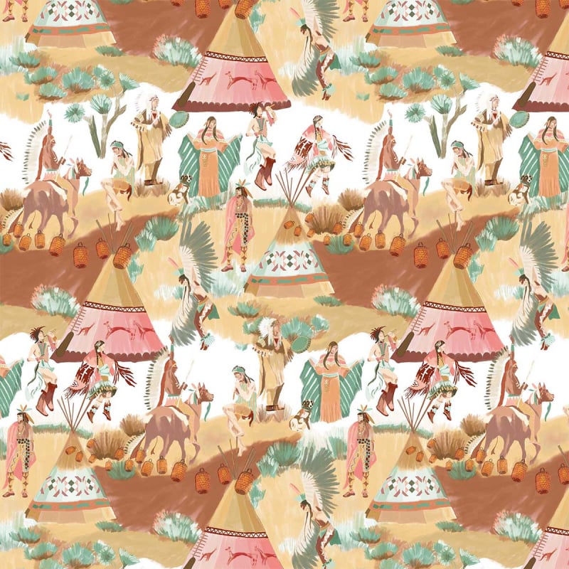 Designed by Gastón y Daniela, the Danza De La Lluvia fabric features a narrative motif centered on Native American peoples. Scenes of ceremonial dances, decorated teepees, horses, and shamanic figures create a vibrant tableau. Each figure is set against a stylized landscape, amidst dry vegetation and a vast open sky. The cotton-linen blend lends a natural, textured feel.