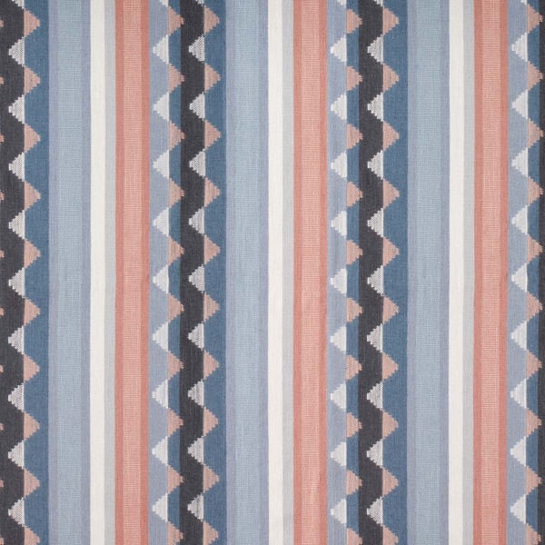 Lutley Stripe by Sanderson is a fabric featuring a geometric pattern inspired by the carved details of historic woodwork. Wide vertical stripes punctuate the surface, interspersed with serrated herringbone motifs and triangular friezes. Cotton and linen intertwine in a supple weave that reveals the natural texture of the fibers. Together, these elements create a graphic weave, brought to life by an architectural rhythm.