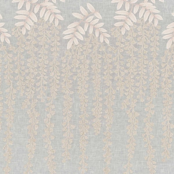 The Jardin Suspendu fabric features a floral pattern composed of slender stems dotted with delicate leaves. The design creates a panorama of stylized wisteria, with the clusters falling against a subtly textured background. The delicate embroidery creates a subtle texture on the surface, which feels soft to the touch. This extra-wide fabric by Étamine combines cotton and linen to create a loose, breathable cloth.