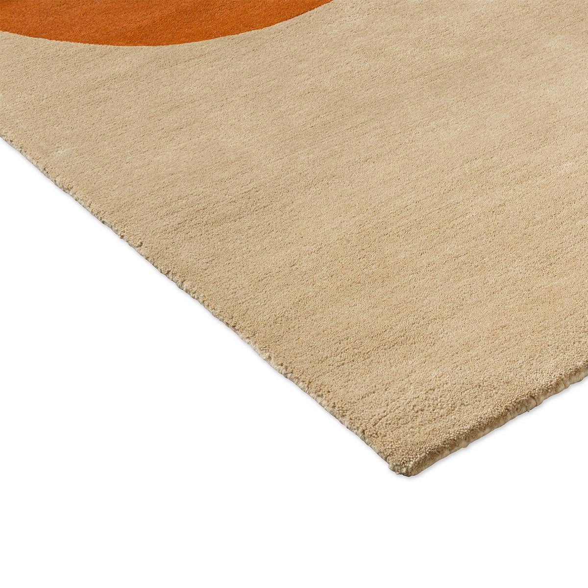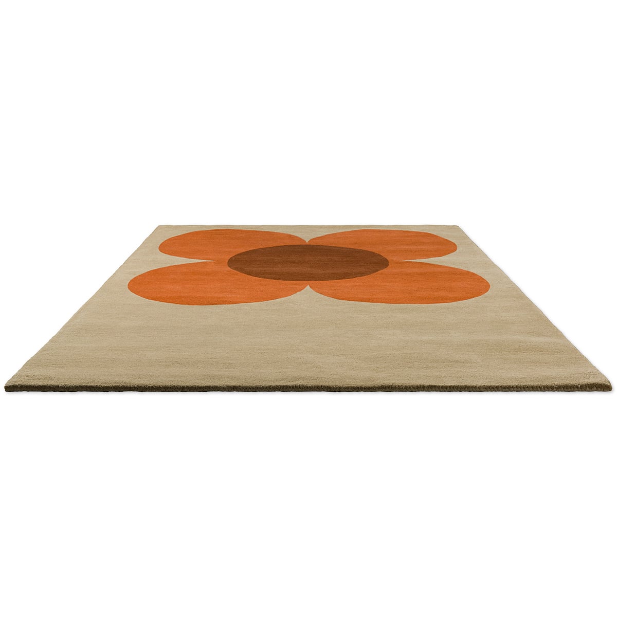 On the Flower Placement rug, a stylized plant composition with soft lines stands out against a solid-colored background. An opulent flower with rounded petals extends across its surface. The ensemble evokes a simple, yet expressive, vintage aesthetic. Hand-tufted in wool, this design created by Orla Kiely reveals a warm and assertive graphic presence.