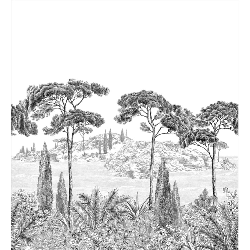 Originally drawn in pen by artists Martine Dubreucq and Isabelle Parmentier, the Péninsule panoramic wallpaper pattern reveals a Mediterranean coastal landscape. Tall pine trees, characteristic of the region, along with oleanders, palm trees, and cypresses, overlook the sea. The palette of nuanced grays and blacks evokes the light, colors, and scents typical of this type of coastline. Published by Isidore Leroy, this design lends a sense of depth and serenity to spaces.