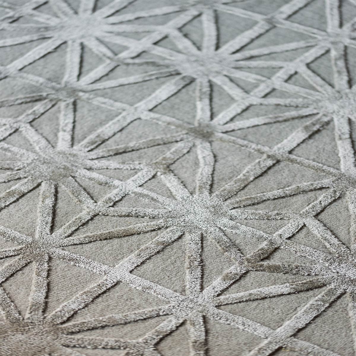 Niki Jones' Astral rectangular rug is inspired by the glittering charm of the stars in the firmament. The designer highlights the raised pattern of a lattice forming a succession of stars on a plain background. The design is enhanced by the brilliant quality and silky texture of bamboo silk.