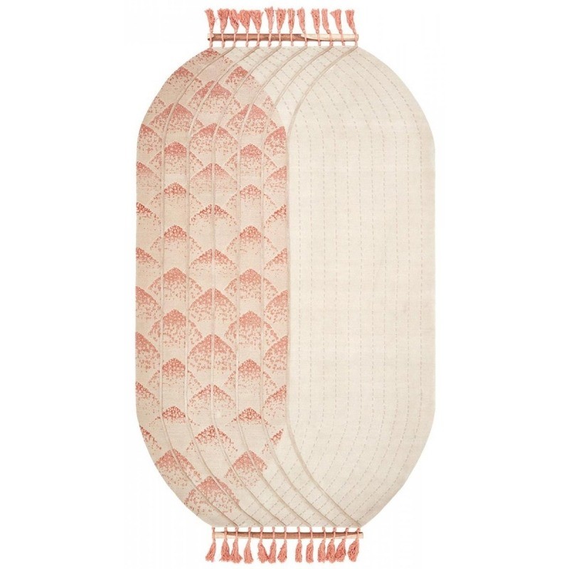 This rug is the result of the research of Faberhama, studio of an Italian designers duo based in Amsterdam, in an approach focused on experimentation while integrating craft techniques. The designers explore the imagery of mythological figures and nomadic population. Inspired by "Jali", these window screens with openings in geometric pattern to observe the world without being seen, part of the rug is covered with lines, continuous or dotted. Another part is colored with a fiery plumage associated with the phoenix, symbol of rebirth. Warm-toned threads glide gently to the ends of the rug and are tied to wooden rods. The rug becomes a window on a distant territory inviting to dream and escape.