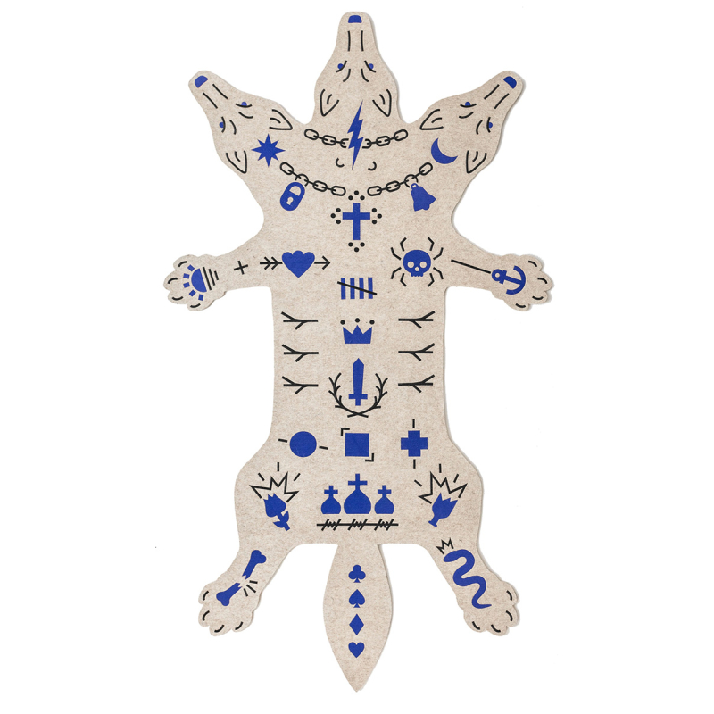 The Wolf rug takes the striking form of a three-headed wolf, frozen in a totemic pose. The animal's silhouette becomes the basis for a dense graphic pattern, somewhere between tattooed language and mystical symbols. Arrows, chains, lightning bolts, and hearts draw an inner map. Made of natural wool and crafted by Budko, this design retains the imprint of ancient craftsmanship.