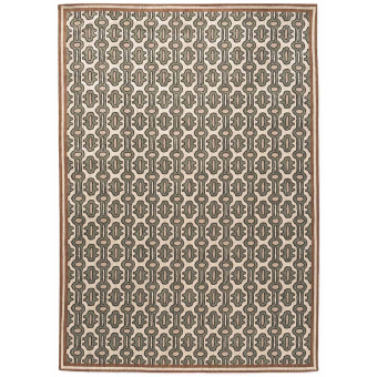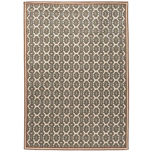 Published by Sanderson, the Matmi rug features a meticulously arranged geometric pattern. Intertwined and architectural shapes compose a dense and bold weave. The graphic repetition establishes a subtle visual rhythm, balanced by a discreet frame. This decor is distinguished by an optical effect that captures the eye and accentuates the depth of the design.