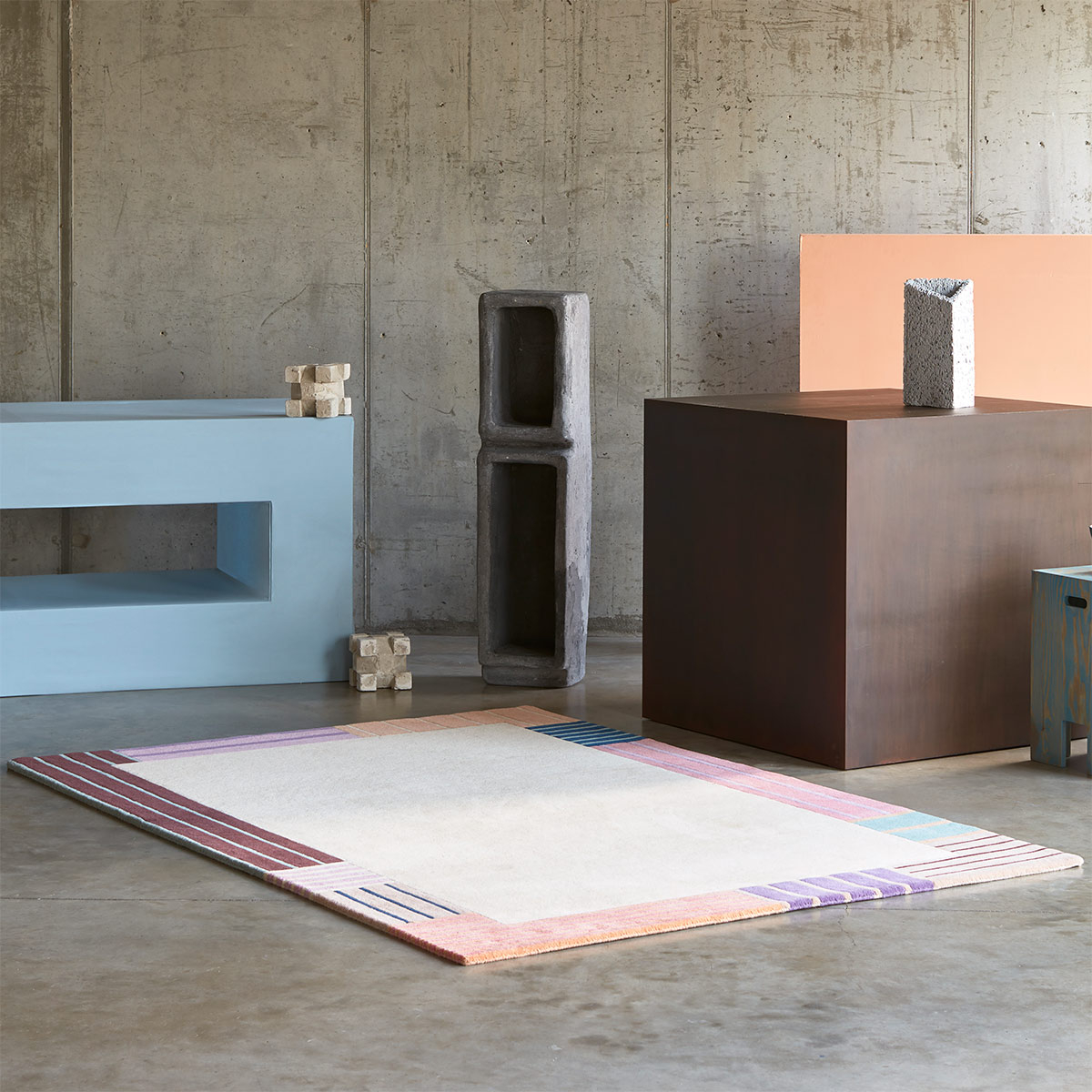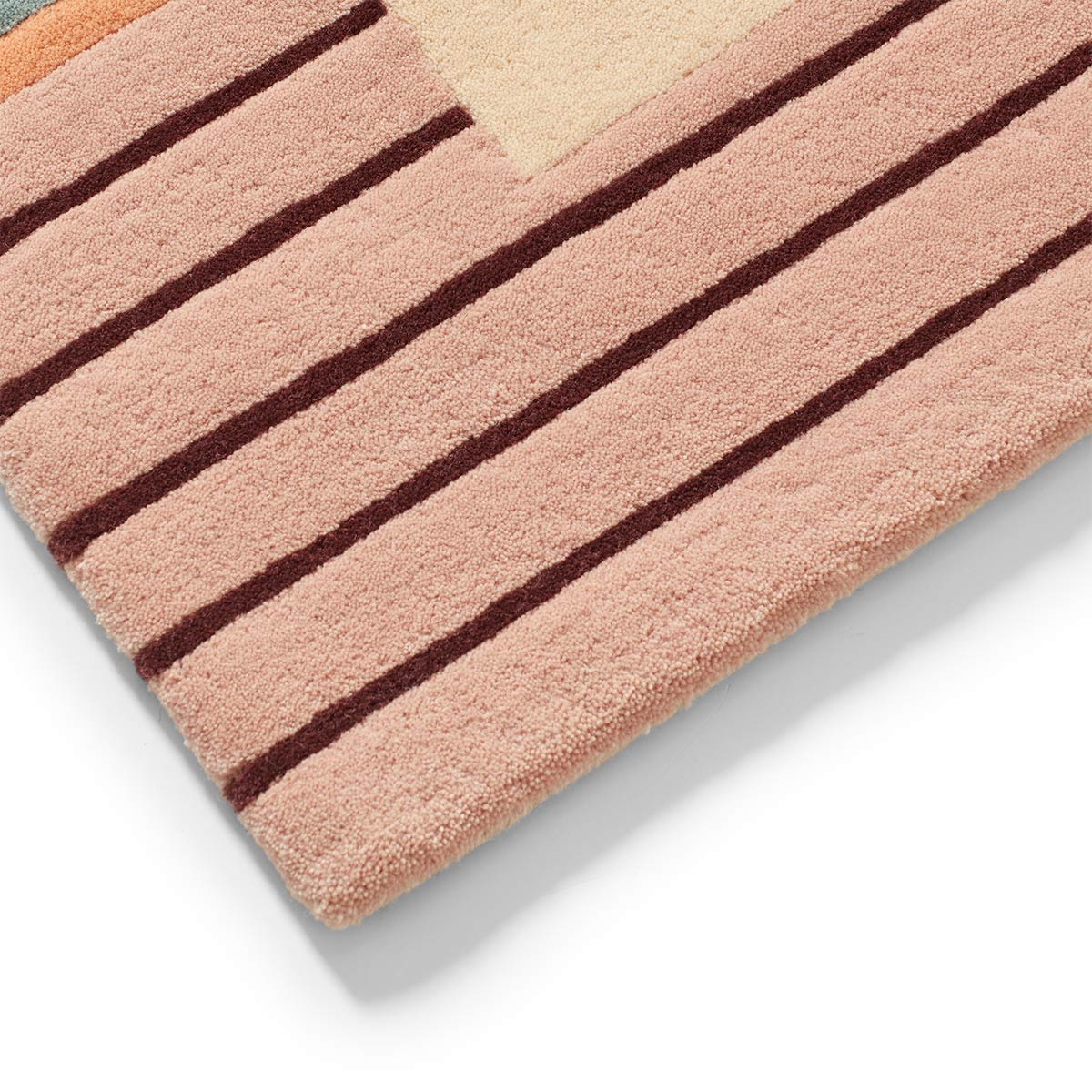 The Curb rug features a geometric composition that is both free and structured. Stripes of various sizes line up along the edge and create a visual rhythm around a bare central field. Made of flat weaving and wool, this decor reveals a dense and supple texture. Published by Floor Story, it combines graphic rigor and natural softness.