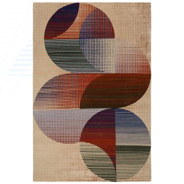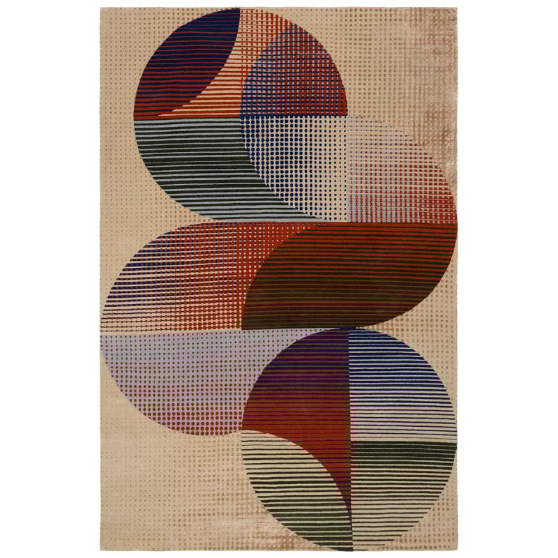 The Halftones Knotted rug reveals a complex weave by Floor_Story in a vibrant interpretation of dots and geometric lines. The circular figures come to life on a natural wool structure, in a rhythmic and contrasting composition. This piece embodies an abstraction carried by the density of traditional knotting. The design evokes a subtle energy that blends form and movement.