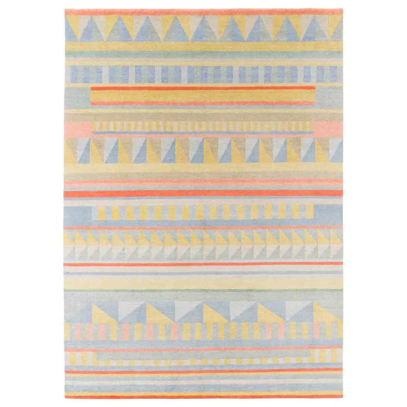 Rakki designed the Ingibjörg rug, whose graphic rhythm is based on a geometric composition that is as complex as it is harmonious. Triangles, rectangles, squares, and stripes follow one another in a soft and vibrant pattern. A warm wool, mixed with nettle and Chinese silk, gives the weave a texture that is both dense and nuanced. Entirely hand-knotted in Nepal, each piece reveals an ancestral know-how.