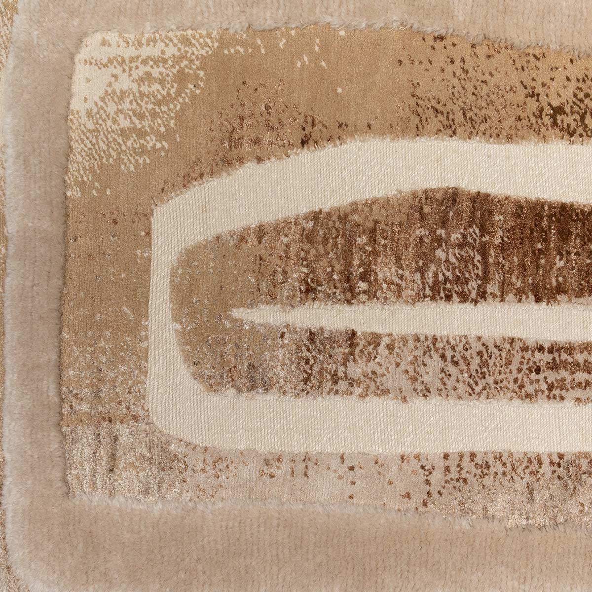 Lelièvre Paris presents Ourika, a hand-knotted rug featuring a geometric pattern. The design features labyrinthine shapes and lines arranged in a mineral-like rhythm. The surface reveals a subtle texture created by mohair, New Zealand and merino wools, and silk. The pattern stretches out like a furrow cutting through the desert.