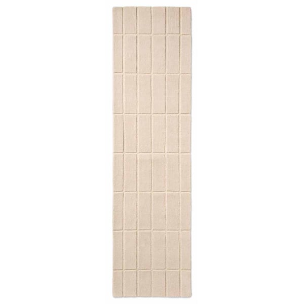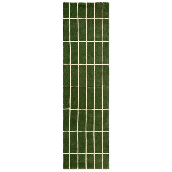 Marimekko's Tiiliskivi hallway rug features a geometric pattern created by a series of precisely drawn, regular tiles. Rectangles form a rhythmic grid that gives the composition a meticulous structure. The surface features a subtle texture that accentuates the sharpness of the lines. Made entirely of wool, this rug features a dense, vibrant material that firmly establishes its presence on the floor.
