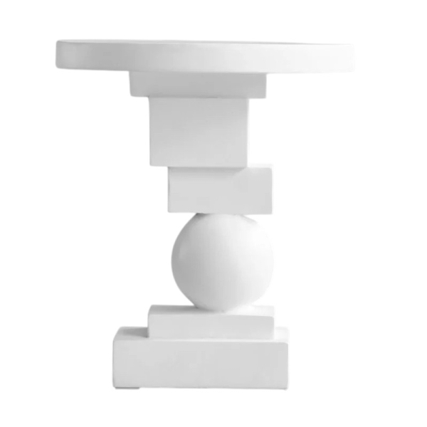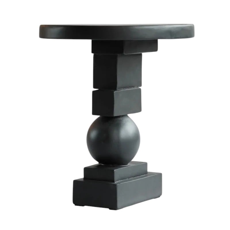 The Artist side table features a dense sculptural silhouette. A sphere, cubes, and a cylinder, superimposed, compose an imposing and totemic geometric pattern. Made of fiber cement, its mineral surface has a hand-painted finish that highlights the raw appearance of the material. Signed 101 Copenhagen, it evokes an architectural structure frozen in a controlled equilibrium.