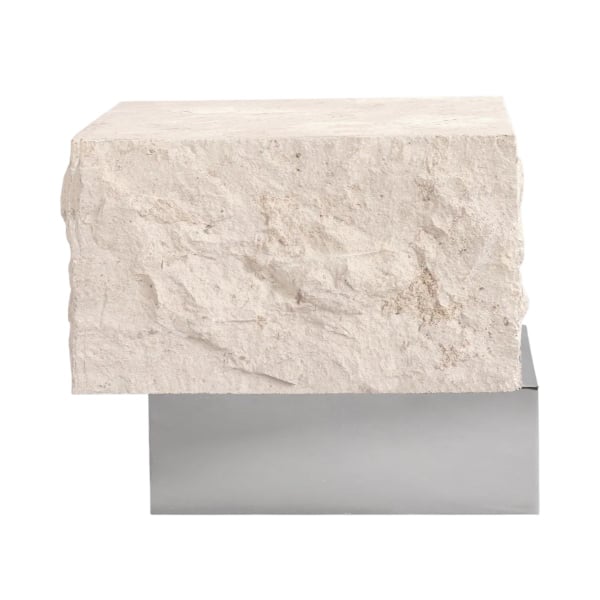 The Temple Low Chrome side table is sculpted around a striking contrast. A block of raw limestone, carved by hand, reveals the irregularities and mineral strength of the rock. The metal base, with its clean lines, accentuates the tension between rough nature and contemporary structure. Signed 101 Copenhagen, this piece showcases a dialogue between balance and tension.