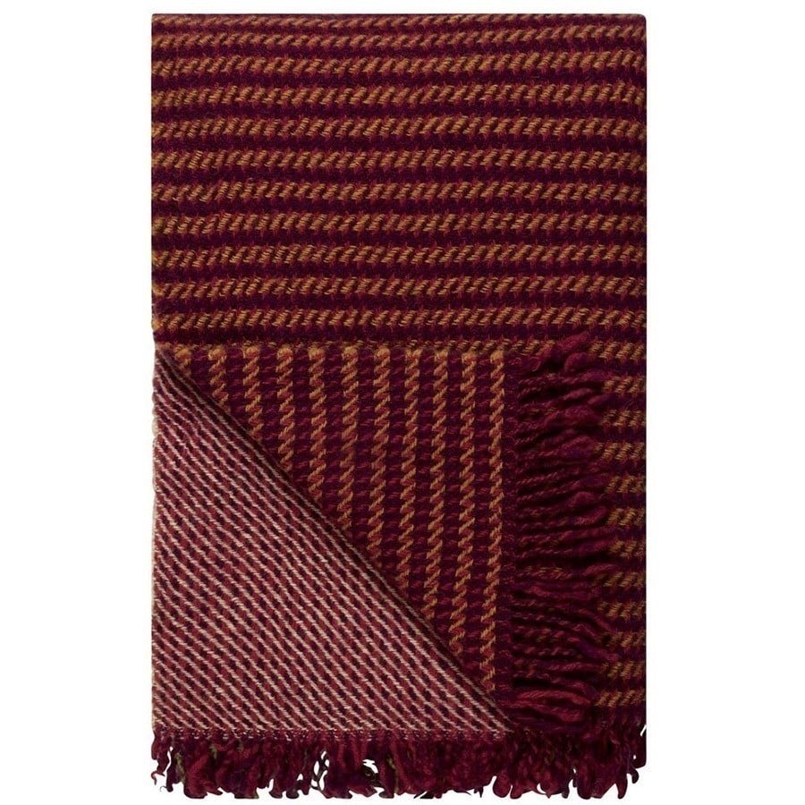 Large checks make up the pattern of the Arklet plaid. Combining a twill and houndstooth weave, this model has a lightly textured surface. It comes in warm and cool colors with bright and soft tones. This fringed design is made from New Zealand wool.