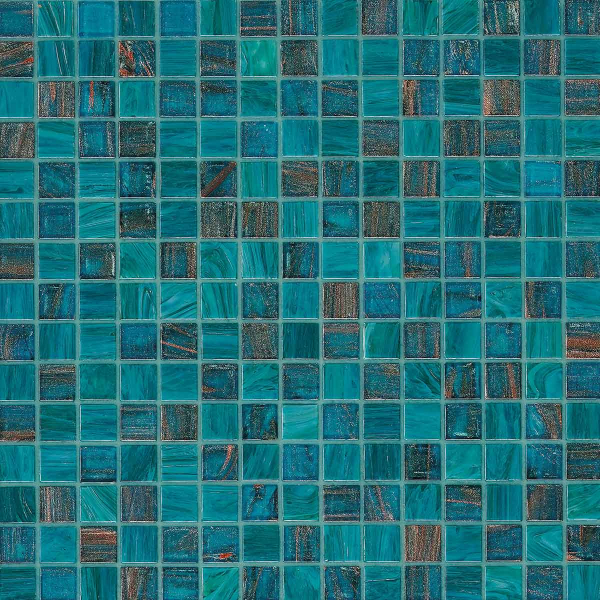 Paola is a glass mosaic proposed by Bisazza. This composition of square tesseraes presents an aquatic design ideal for a pool for example. Its bluish tesseraes each have their own appearance. Some are enhanced by a golden hue while others have light glitter.