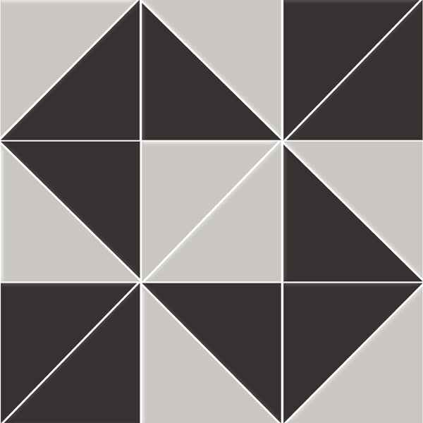 Mosaic Decor 2 is a tile with a geometric pattern based on a lively arrangement of two-tone triangles. The precisely arranged shapes compose a symmetrical visual rhythm. Made of glazed porcelain stoneware, this model by Ceramica Vogue has a surface with clean lines. It reflects a search for balance and contrast in a graphic aesthetic.