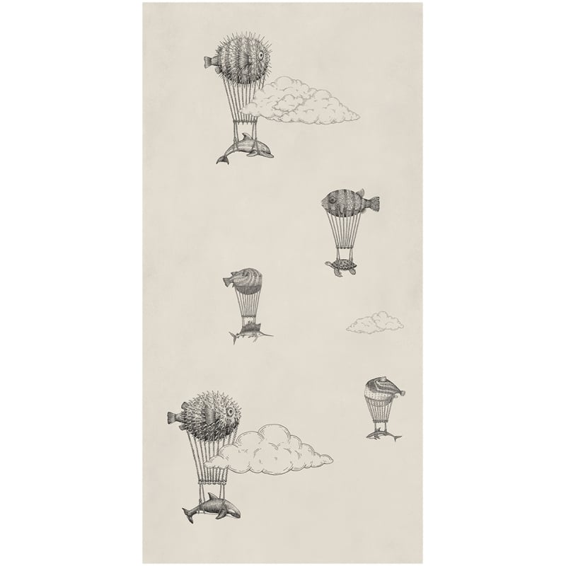 Porcelain stoneware Mongolfiere large slab is a tile with a surreal and illustrative pattern. In a dreamlike sky, suspended fish carry marine creatures in a floating ballet. The design is distinguished by the precision of the lines that evoke an ancient engraving full of fantasy. Signed Bardelli, this generously sized model infuses surfaces with visual poetry.