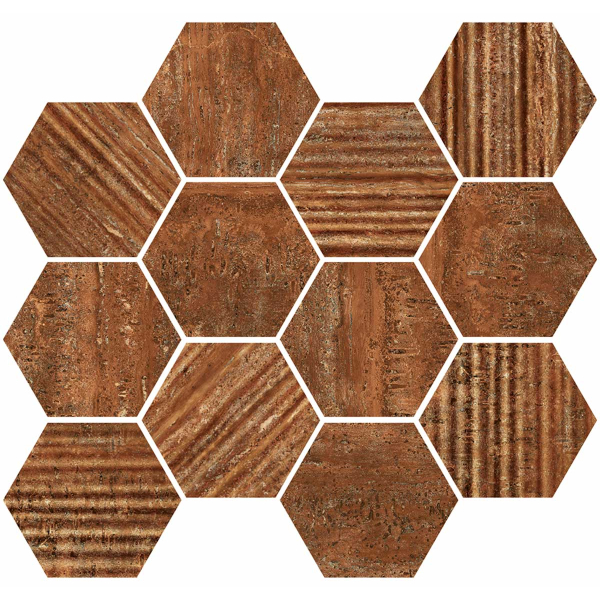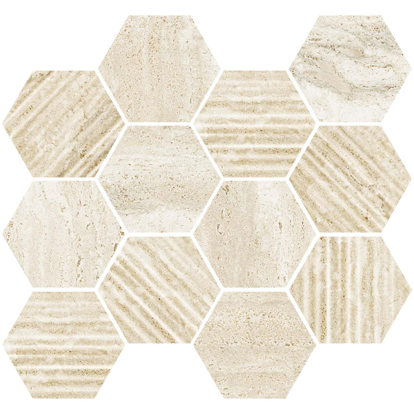 Mosaic Mosaico Exa reveals a geometric pattern chiseled in porcelain stoneware. Its hexagonal tiles alternate irregular streaks and textures imitating stone, in a subtle arrangement of directional effects. This tile visually structures the space through the contrast of the lines that suggest a discreet relief. The pattern designed by Fioranese recalls the raw elegance of precisely shaped minerals.