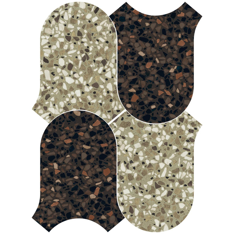 Designed by 41zero42, the Chicco Onda Mosaic tile features a geometric pattern inspired by terrazzo. Its freeform, undulating contours create a distinctive silhouette that evokes a fluid, delicate movement. Irregular mineral shards are subtly scattered across the surface. The graphic rhythm creates a vibrant and harmonious composition.