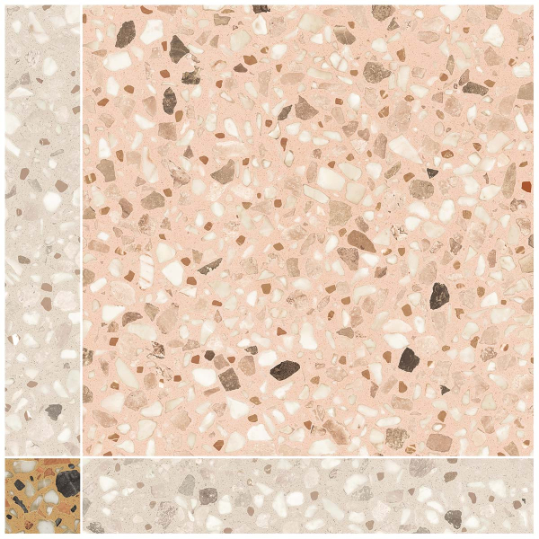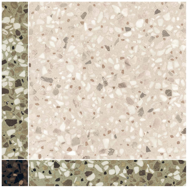 A mineral pattern inspired by terrazzo covers the Chicco Regolo mosaic from 41zero42. Composed of square and rectangular shapes, the tile creates a dynamic, rhythmic surface. The stone fragments intertwine delicately, creating a vibrant pattern. The material reveals a subtle texture and a nuanced visual impact.