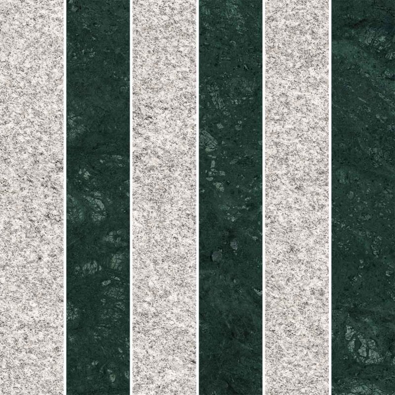 Designed by 41zero42, the Stripes Mosaic features a geometric pattern with a rhythmic feel. Regular stripes follow one another in slender bands, creating a fluid and structured visual rhythm. The subtly nuanced mineral effect evokes the depth of marble and the density of granite. Its porcelain stoneware surface projects a balanced and contemporary graphic presence.