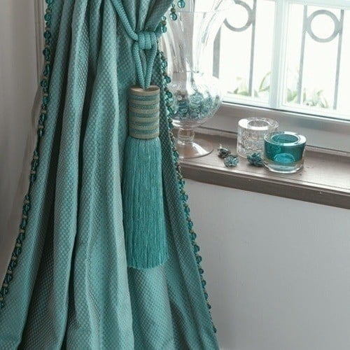 L'embrasse de rideau Opale alterne des anneaux de bois et des fils coupés à l'aspect velouté. Les longues franges fines, dans la continuité du gland, sont souples et élégantes.