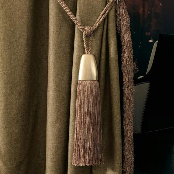Embrasse de rideau avec éléments dorés. Epurée, chic et ethnique, cette passementerie haut de gamme de la maison Houlès ravira votre intérieur.