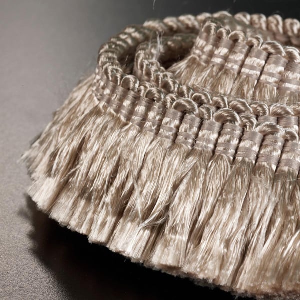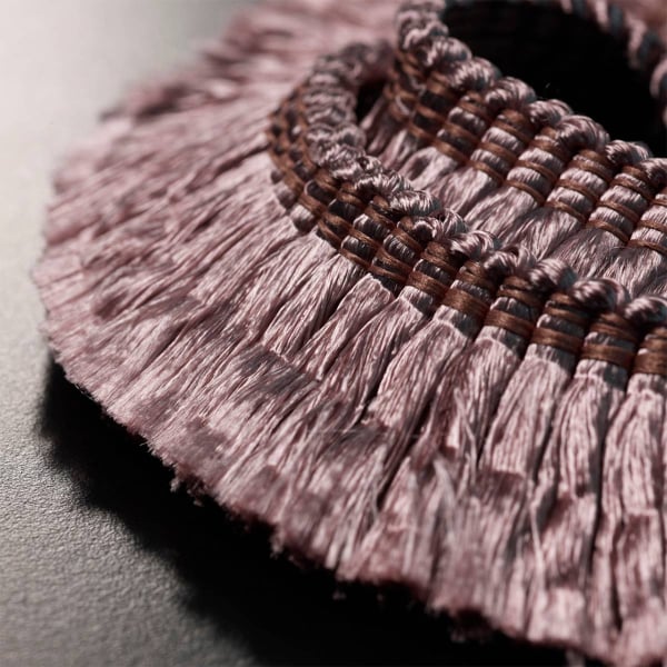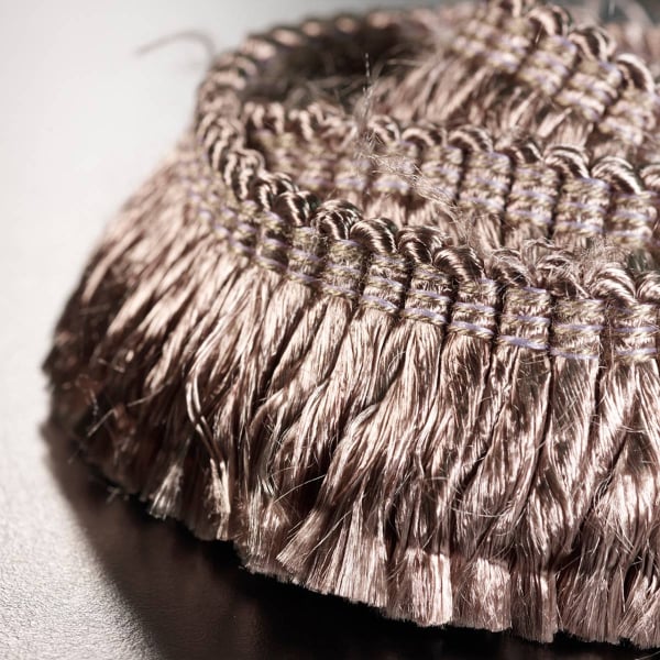 The PIN019 Fringe is a decorative trimming, composed of shiny strands arranged with graphic precision. Carefully braided, the threads form a thick, silky, and structured whole. The rhythmic base is organized around a regular weave that evokes traditional textile ornaments. Dedar has developed a mastered artisanal style, marked by an ethnic touch.