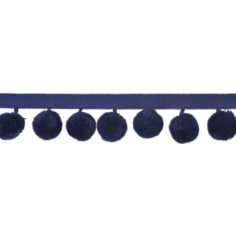 The Calypso 55 mm pompom fringe is a trimming punctuated by an ornamental geometric pattern. This decorative border, composed of spherical shapes, creates a simple and structured aesthetic. Pompoms suspended from a woven ribbon draw a regular and balanced line. Through its discreet size, the textile piece expresses a rigor and a subtle know-how specific to Houlès.