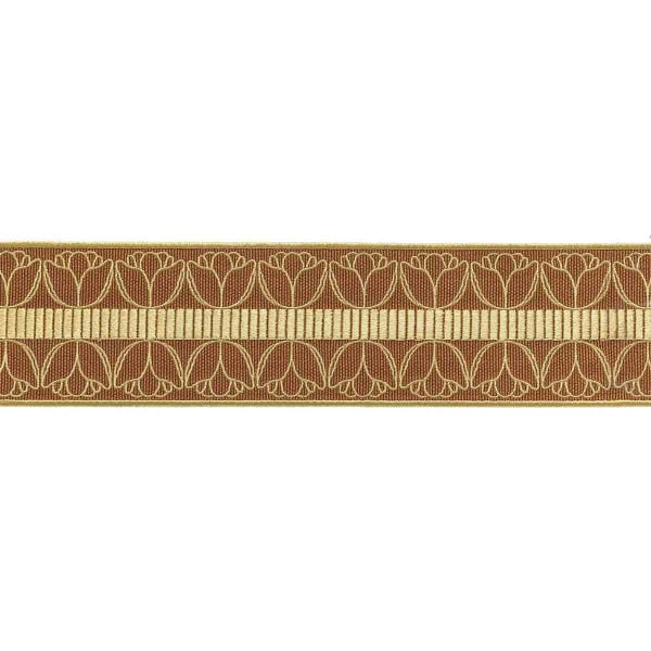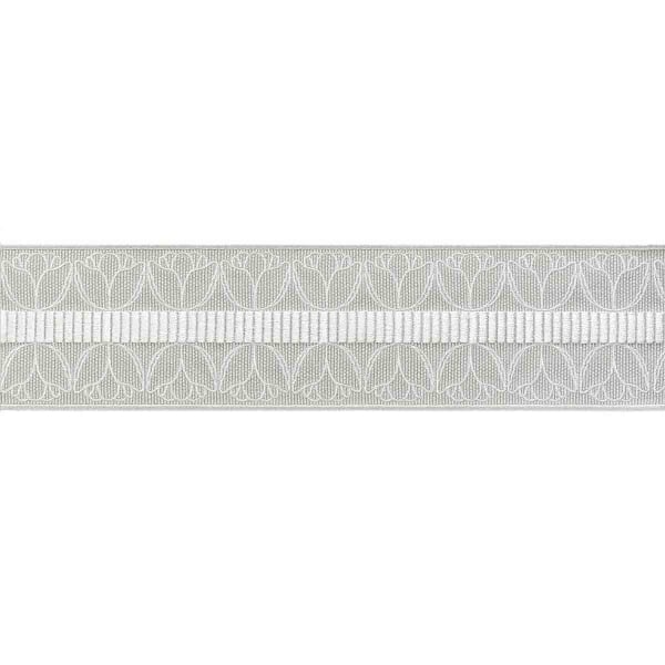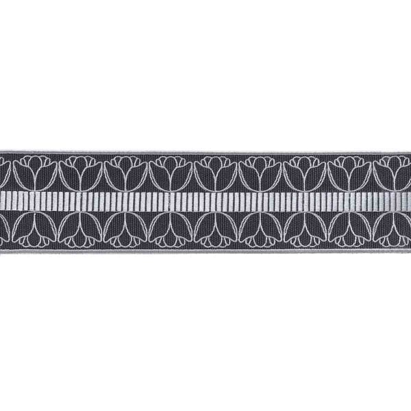 The Cornely Braid reinterprets textile ornamentation with a refined visual language. Designed by Houlès, it combines a stylized pattern of embroidered tulips with a series of vertical stripes arranged around a central axis. The design unfolds on a fine weave, accentuated by a subtle border that balances the composition. The whole design conjures up a gentle rhythm, a blend of geometry and blossoming.