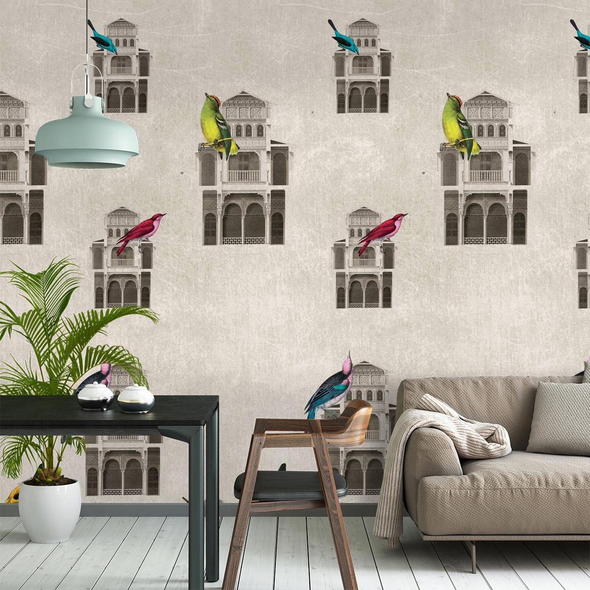 à travers ce superbe panneau Kathmandu, Tres Tintas adresse un clin d'œil à la cité millénaire indienne, étape incontournable de la Route de la Soie. Sur un fond beige, un bâtiment historique affiche son architecture richement ouvragée avec un contraste qui crée un effet de relief. Des oiseaux de couleurs vives réveillent la composition.