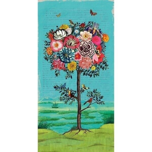 Ce paysage est planté d'un arbre-bouquet fleuri de tulipes, iris et œillets aux couleurs spectaculaires. Des oiseaux et papillons agrémentent la composition. Pip Fantastree est un panneau de papier peint Pip Studio qui donne à votre espace une beauté irréelle. Un texte se devine en arrière plan, ajoutant au mystère du décor.Il s'agit d'une réalisation sur papier intissé.