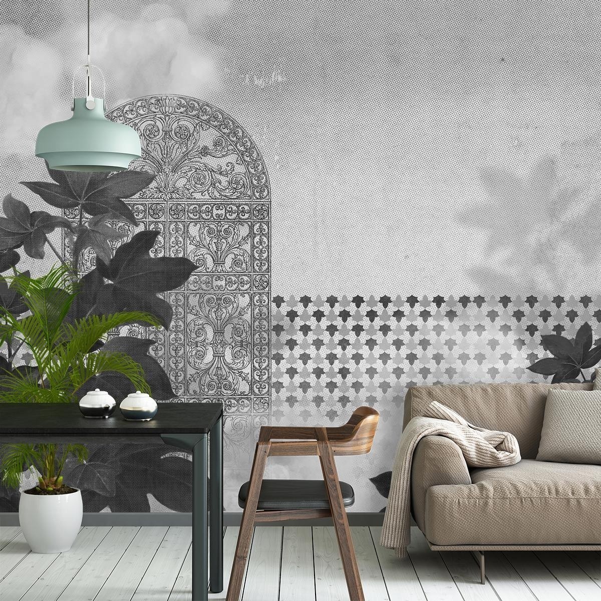 Imprimé sur support intissé, Ferraem Mural de Tres Tintas représente un jardin orné de faïences et mosaïques mauresque. Au travers les feuillages de plantes exotiques, la brume se dissipe et révèle les détails d'une porte orientale. Ce panneau est disponible en vinyle sur support intissé. Contactez nous directement.