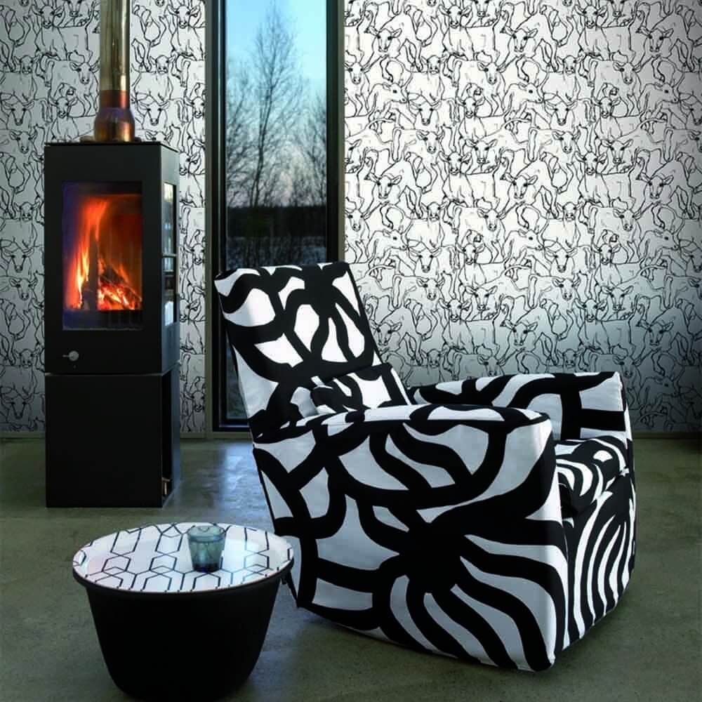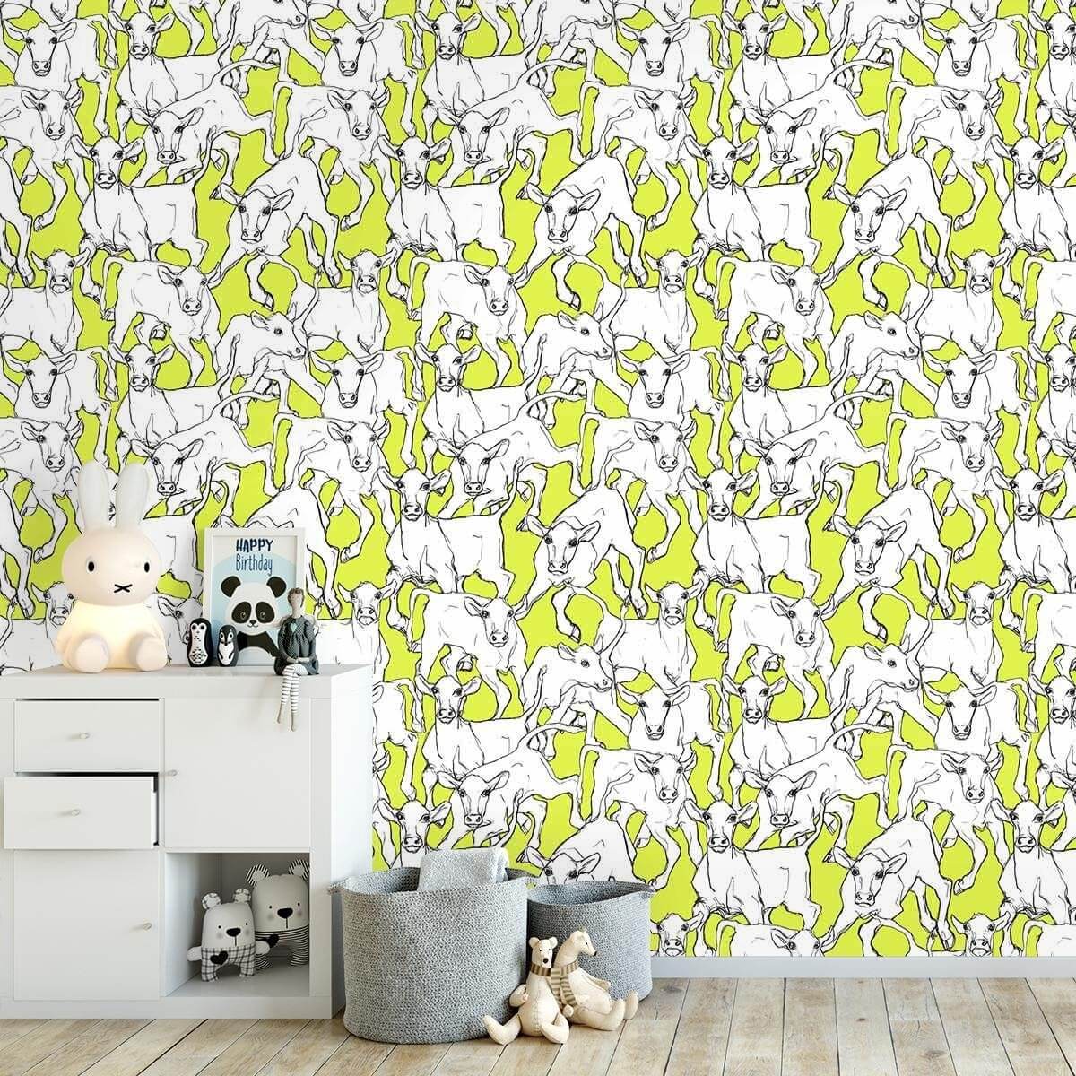 Iltavilli is an animal-themed wallpaper that Miina Äkkijyrkkä designed for Marimekko. Its surprising motif shows a flock of calves frolicking in the countryside. The drawing arouses in us a sense of freedom and escape. This model combines the originality of a handmade sketch with a modern style.