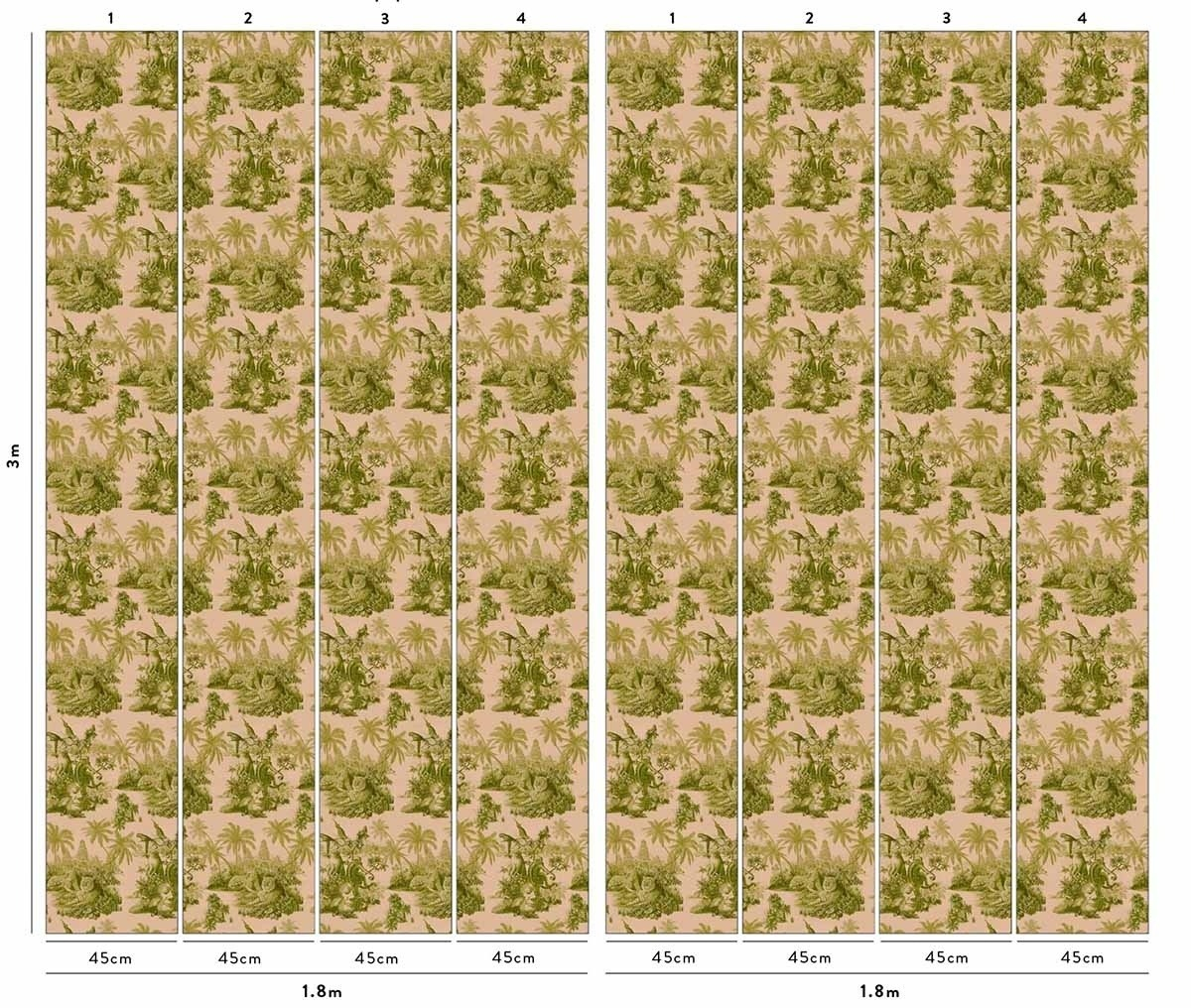 Inspired by French toile de Jouy of the 18th century, the eco-friendly Sumatra wallpaper pays tribute to the Indonesian island. The pattern by House of Hackney depicts mystical scenes that happen in the jungle. One of them shows resting Sumatran tigers before palm trees and temples. The other one displays a carved head on which monkeys and parrots rest.